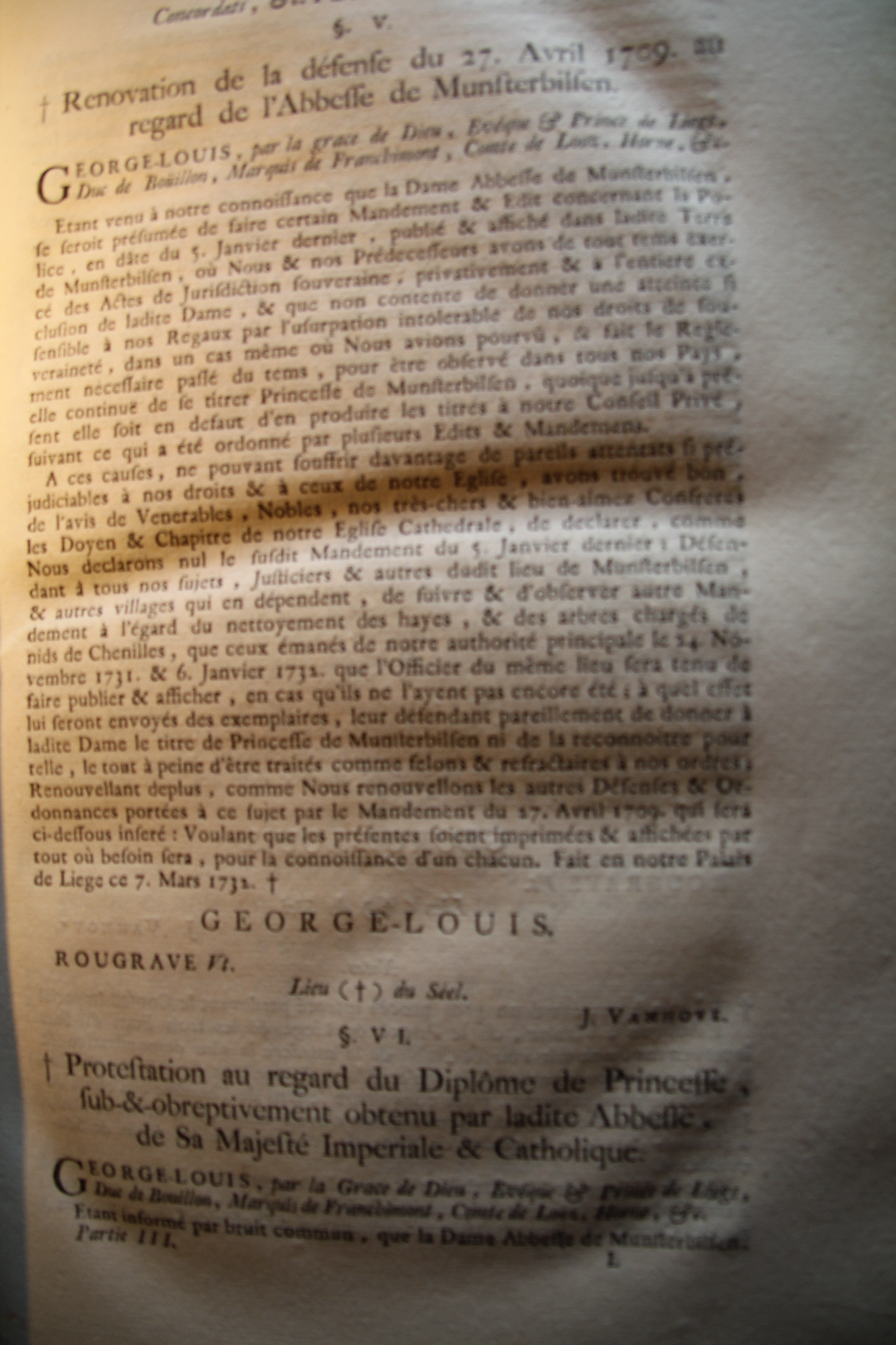 In Louvrex vindt men enkele verwijzingen naar de eigenzinnigheid van de abdissen van het stift van Munsterbilzen die zich titels wilden toe igenen waarop ze geen recht hadden zoals prinses en daarmee de souvereiniteit over al haar gebieden bekomen. Zoals in onderstaande documenten te lezen was dit al bezig sinds 1709, het eerste verzoek werd weg gewuifd door de prins-bisschop. In 1750 heeft ze zich direct gewend tot de Duitse keizer en die titel bekomen van hem. Wel heeft ze dit met grove leugens bekomen en dit is aangevochten door de prins-bisschop te Wenen.