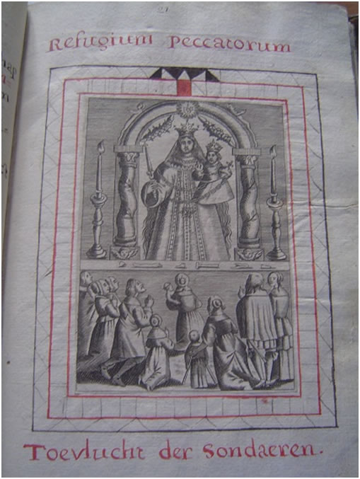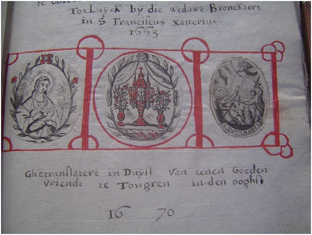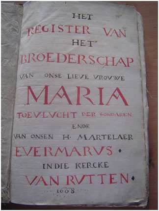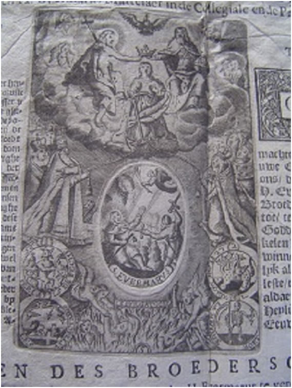 Ets op pamflet van “ Het Broederschap van OLV, toevlucht der sondaeren en van den H.Evermarus Martelaer in de Collegiale en de Parochie Kercke van Rutten 1668 .