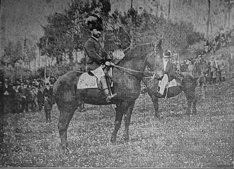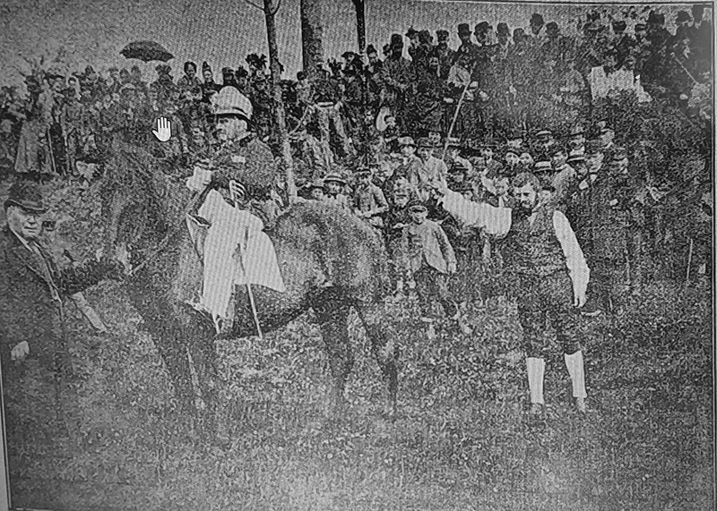 Een foto met humor. De ontsnapte pelgrim doet alsof hij het paard van Hacco een tik gaat geven. Hacco zou toen 82 jaar zijn geweest, sommige beweerden zelfs 86 jaar.