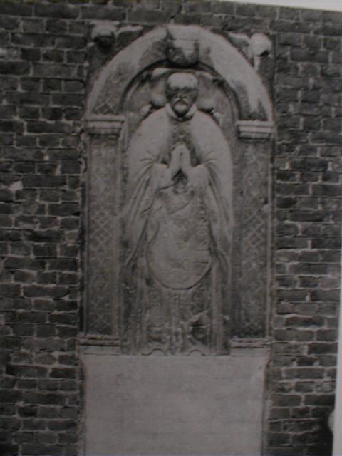 Le grand pierre dans le mur extérieure de l'église dit « Hic jacet sepultus Dominus Joes Turrinus Chrianitatis cocilii Tongren Decanus necuon ecclesiae parochialis S. Georgii pagi hujus de Schendremael pastor qui obiit a° 1635 .. «