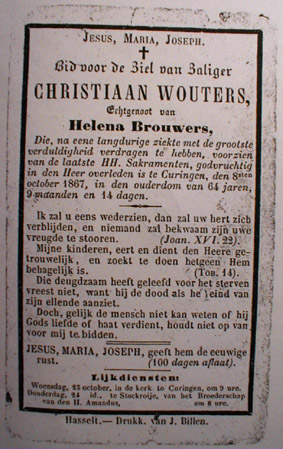II Wouters Christiaan,° SintGeertruid 24/12/1802 en + 8/10/1867 te Kuringen, was eerst landbouwersknecht te Ekkelrade ( wonende ) onder Sint-Geertruid , dan verhuisd naar Maaseik op een hoeve en daarna heeft weduwnaar Christiaan gewoond op de hoeve naast de verdwenen abdijkerk van Herckenrode als pachter op huisnummer 2 . Hij was gehuwd met Brouwers Helena °7/9/1808 en + 11/9/1862 te Maaseik, waaruit 8 kinderen ( zie III )