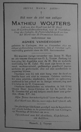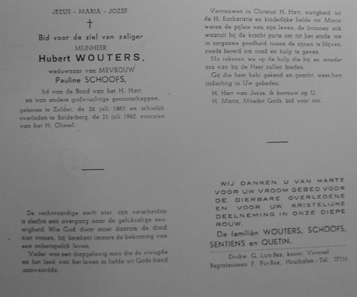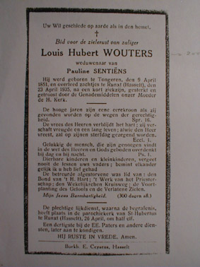 IIIb Louis Hubert Wouters,° Tongeren 9/4/1851 + 23/4/1935 , gehuwd te Zolder 1/3/1876 met Sentiëns Pauline-Marie ,° Zolder 23/6/1851 + 21/1/1911, waaruit 7 kinderen . ( zie IV a )
