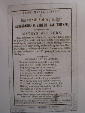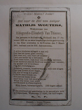 IIId Mathijs Wouters °1835 + 1901 , gehuwd met Elisabeth VanTienen, ° 1841 Alken waaruit 3 kinderen ( zie IVc ) Ze woonden in het gehucht Demer , Kuilberg n° 80 .