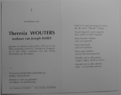 Vc 1 Theresia Wouters , gehuwd met Joseph Barée