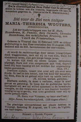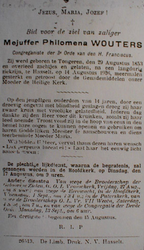IIIa Mejuffrouw Philomena Wouters, ° 29/8/1853 te Tongeren en + te Hasselt 14/8/1926 Zij was blind .