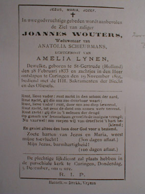 IIIc Joannes Wouters ° 1833 + Kuringen 1895 en gehuwd 1° Anatolia Scheurmans en 2° Amelia Lynen , waaruit 5 kinderen ( zie IVb ) Ze woonden in bij Schuermans Arnold in de Dorpstraat n° 81 , tot hij hertrouwde .